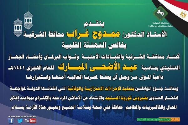 محافظ الشرقية يهنئ أبناء المحافظة بمناسبة عيد الأضحى المبارك