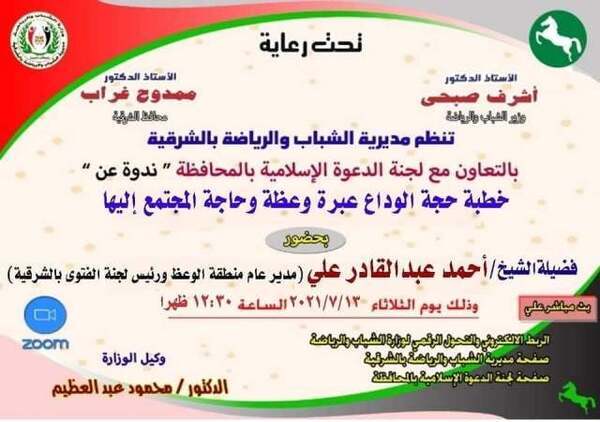الشباب والرياضة بالشرقية بالتعاون مع لجنة الدعوة الإسلامية بالمحافظة تنظمان ندوة دينية بعنوان ” خطبة حجة الوداع عبرة وعظة ” (أون لاين)