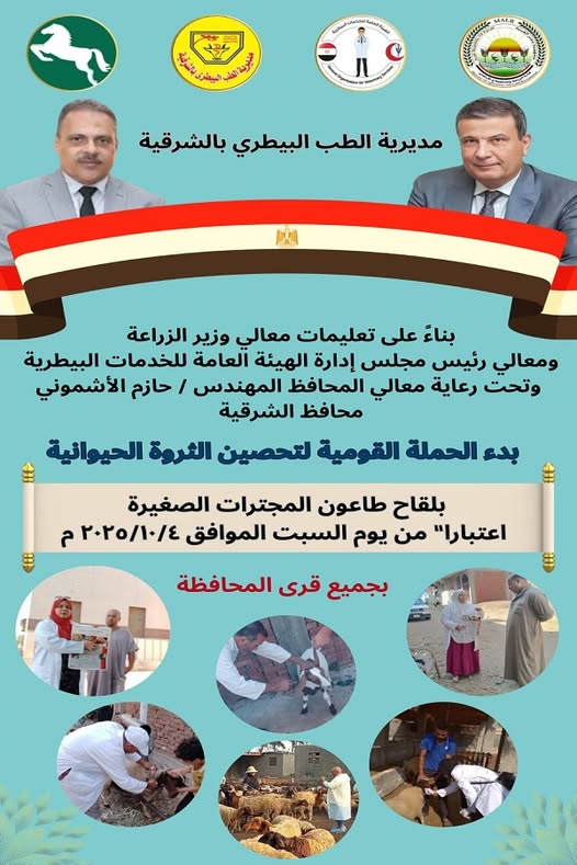 أعلن المهندس حازم الأشمونى محافظ الشرقية عن إنطلاق الحملة القومية للتحصين ضد مرض طاعون المجترات الصغيرة يوم السبت الموافق ٤ أكتوبر ٢٠٢٥م بجميع المراكز والقرى التابعة لها بالمحافظة ، للحفاظ على الثروة الحيوانية وتوفير أوجه الدعم والرعاية البيطرية لوقايتها من الأمراض والعمل على زيادة إنتاجيتها لتلبية احتياجات السوق المحلي