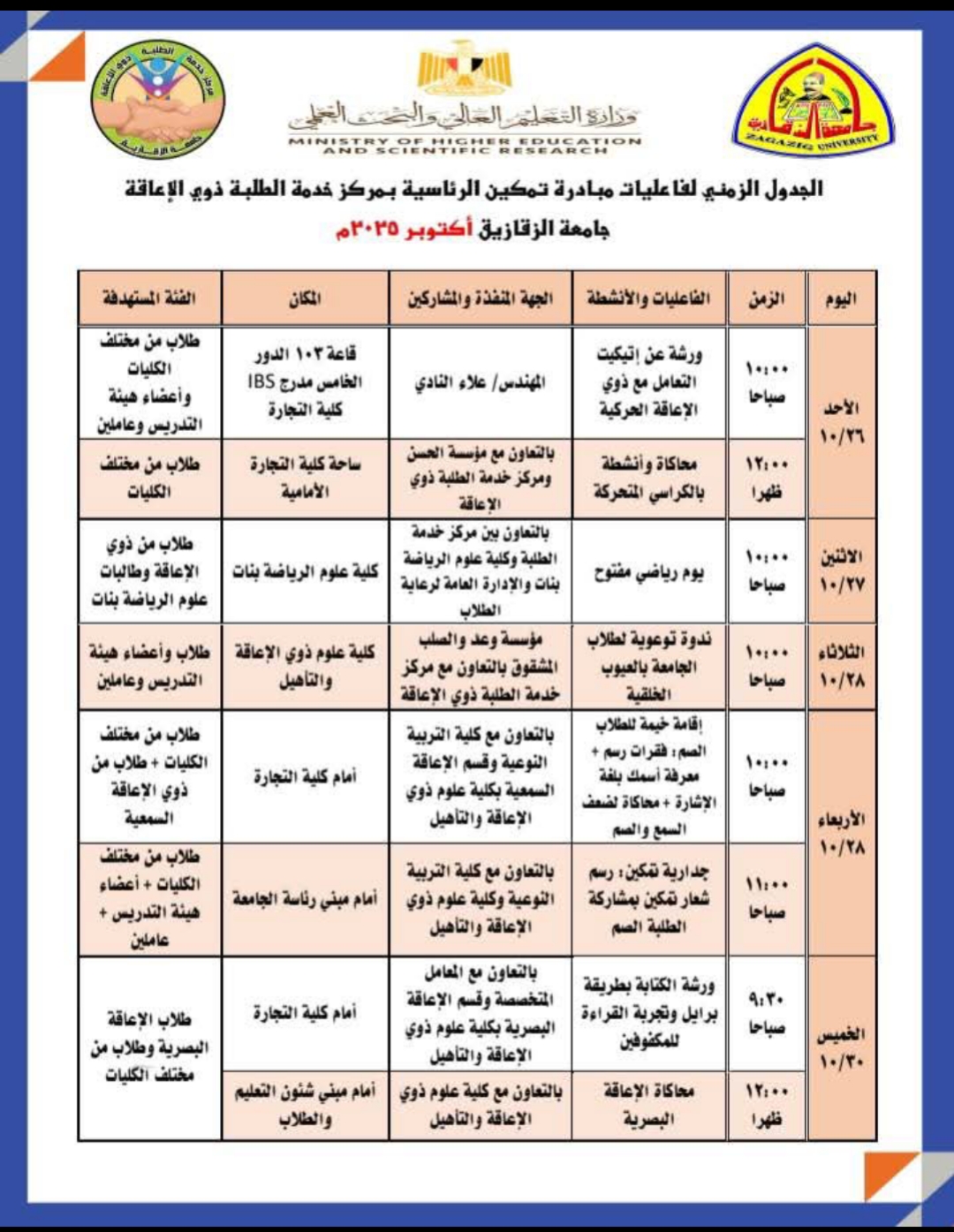 تحت رعاية الأستاذ الدكتور خالد الدرندلي رئيس جامعة الزقازيق، والدكتور هلال عفيفي نائب رئيس الجامعة لشئون التعليم والطلاب، والأستاذ الدكتور إيهاب الببلاوي مستشار رئيس الجامعة لخدمة ذوي الإعاقة، ونائب رئيس الجامعة لشئون للدراسات العليا والبحوث شاركت جامعة الزقازيق في فعاليات المبادرة الرئاسية “تمكين”، التي أطلقتها وزارة التعليم العالي والبحث العلمي للعام الدراسي 2025–2026، برعاية فخامة الرئيس عبدالفتاح السيسي، لدعم وتمكين الطلاب ذوي الإعاقة داخل الجامعات المصرية.