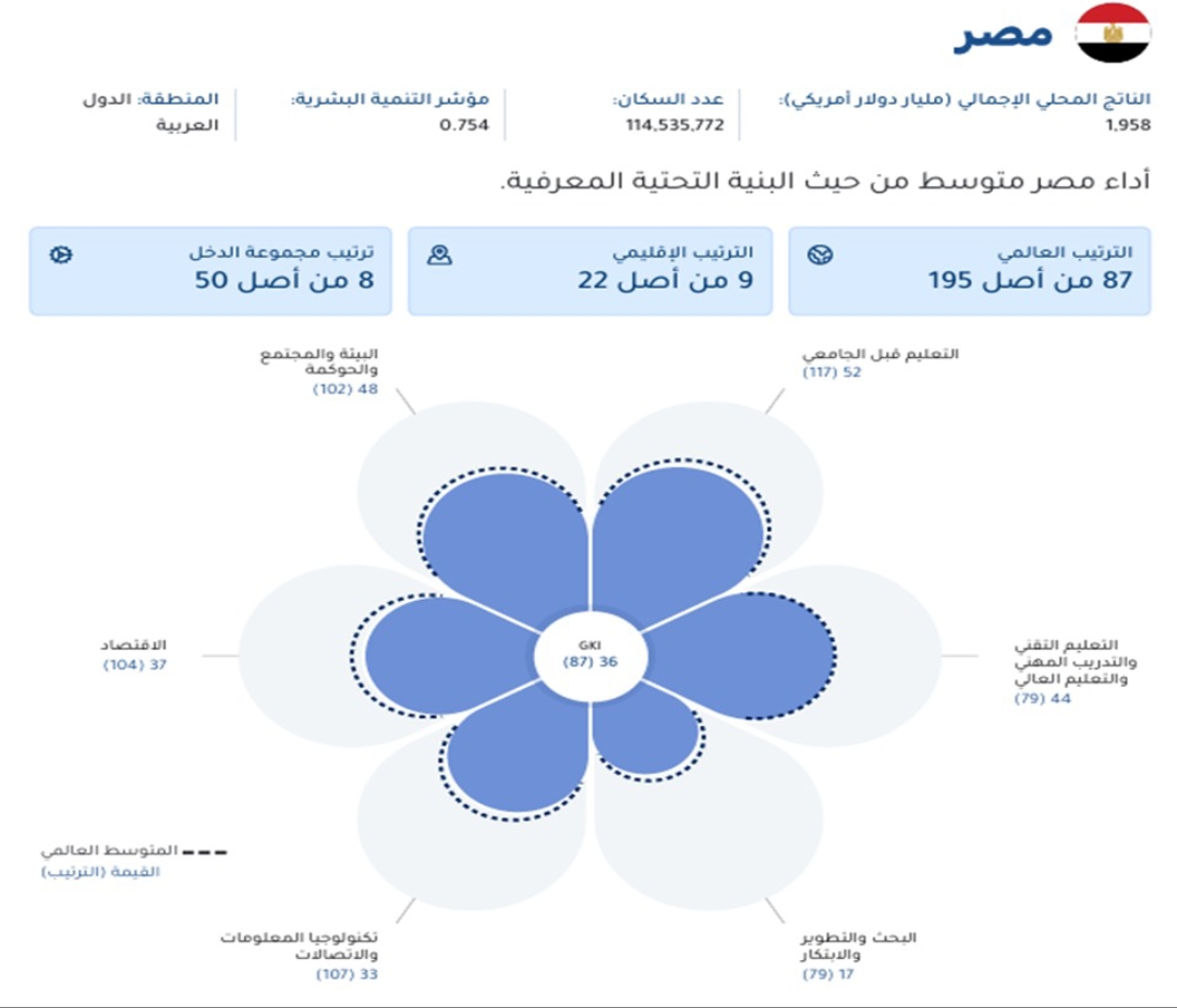 وفي إطار السعي نحو تحقيق رؤية مصر 2030، جاءت نتائج مؤشر المعرفة العالمي 2025 لتسلط الضوء على مسار مصر في تعزيز قدراتها المعرفية. حيث احتلت مصر المرتبة 87 عالميًا من بين 195 دولة، ما يعكس تقدمًا طفيفًا مقارنة بالسنوات الماضية، لكنه يشير أيضًا إلى تحديات كبيرة أمام تحقيق اقتصاد قائم على المعرفة.
