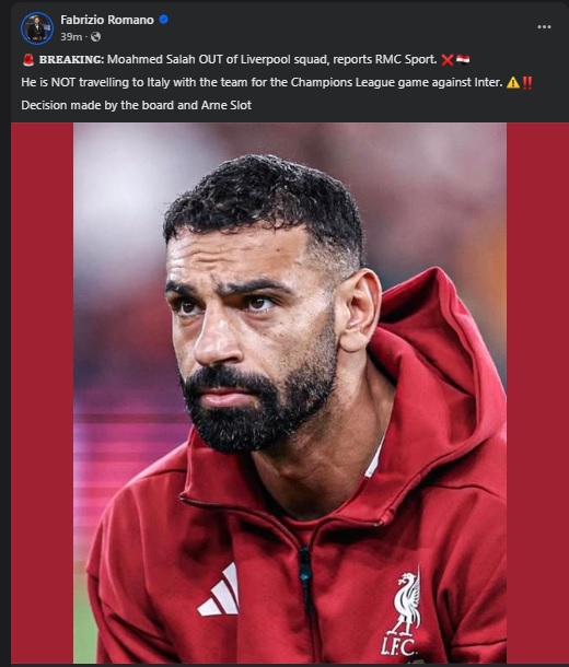 صلاح لن يكون متاحًا للعب ضد إنتر، في وقت يترقب فيه الجمهور موقفه مع النادي في الفترة المقبلة، خاصة مع اقتراب فترة الانتقالات الشتوية، حيث تتصاعد التكهنات حول مستقبله.