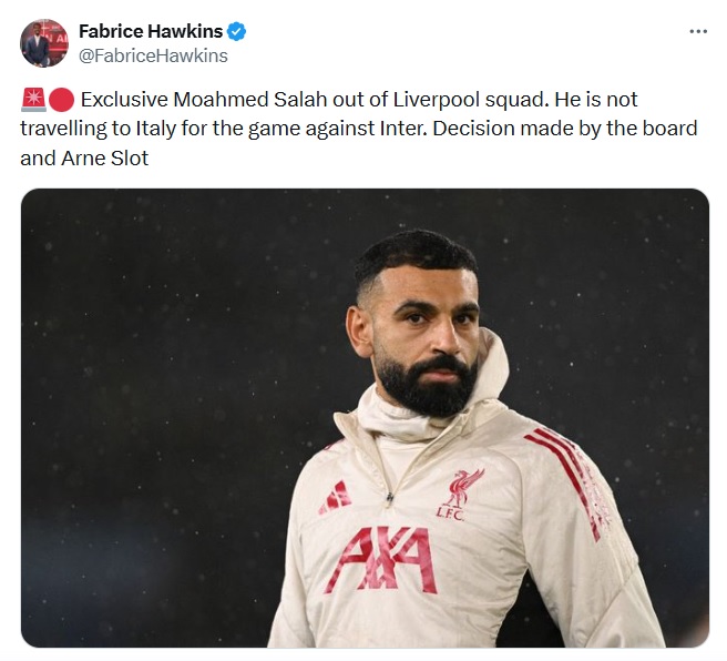 قرر نادي ليفربول استبعاد نجمه المصري محمد صلاح من قائمة الفريق المسافرة إلى إيطاليا لمواجهة إنتر ميلان في المباراة المقبلة، وذلك بعد اجتماع بين مجلس إدارة النادي والمدرب أرني سلوت.