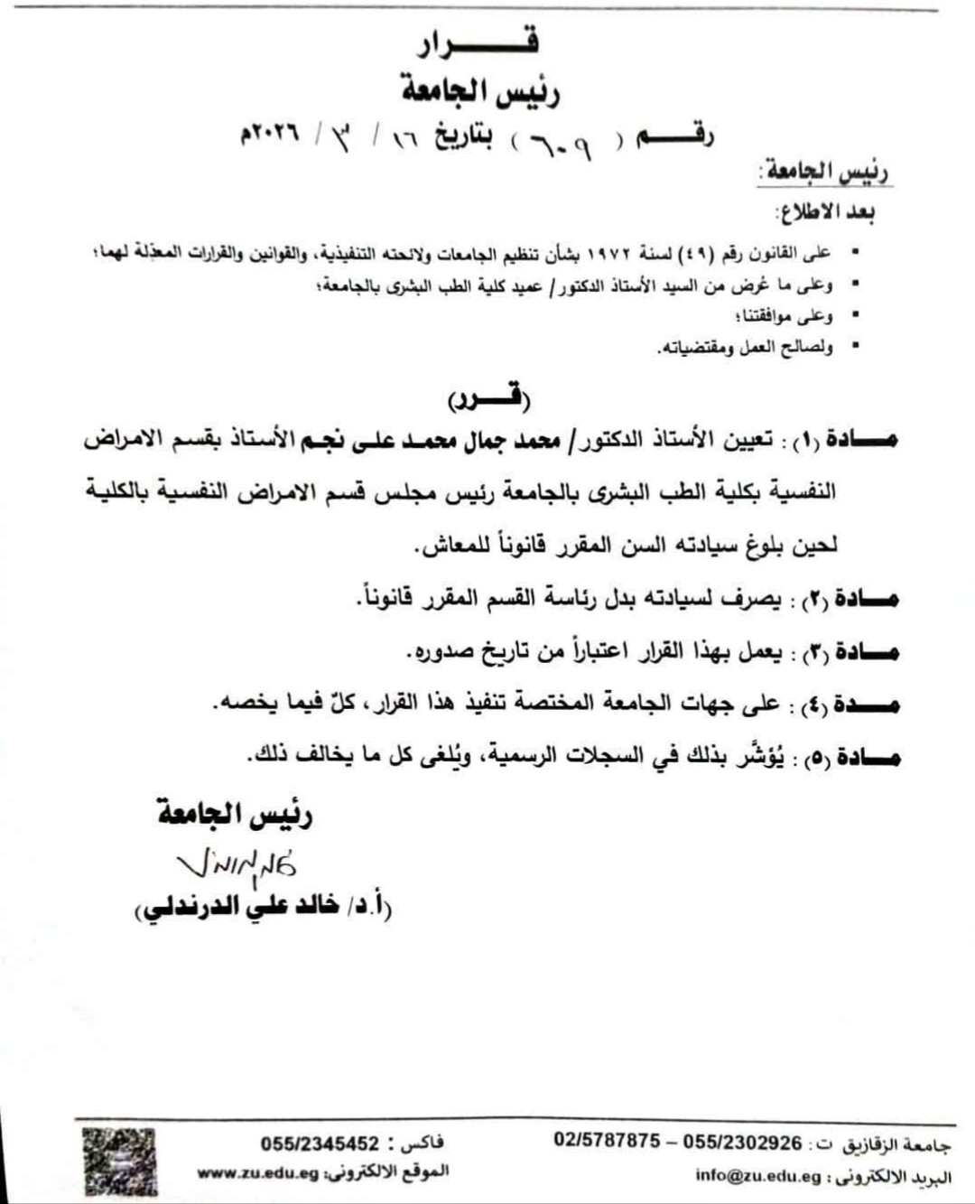 أصدر الأستاذ الدكتور خالد الدرندلي رئيس جامعة الزقازيق القرار رقم (٦٠٩) بناء على ثقة الأستاذ الدكتور محمود مصطفي طه عميد كلية طب الزقازيق بتكليف الأستاذ الدكتور محمد جمال نجم برئاسة قسم الطب النفسى و علاج الادمان بكلية طب الزقازيق.